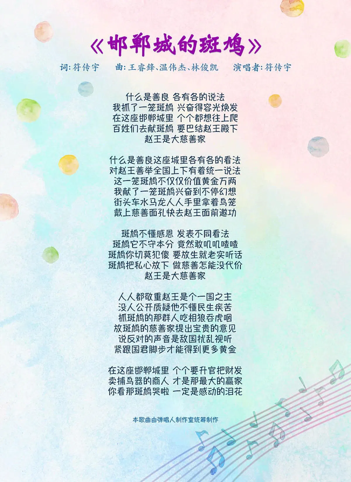 新空下2022创作合辑:《邯郸城的斑鸠》发布/2023年2月11日 07:00小标准中大《邯郸城的斑鸠》是由光洋中学的王睿鋒作词,符传宇作曲。 本歌曲由弹唱人制作室统筹制作。所有入选作品的词曲版权归属推广华文学习委员会。浏览新空下专题页面,就可以知道更多相关信息! 新空下全国学生新谣歌唱及创作比赛新谣上一篇“新空下”2023全国学生新谣音乐节暨学生创作歌曲合辑新闻发布会下一篇新空下2022创作合辑:《差不多先生》