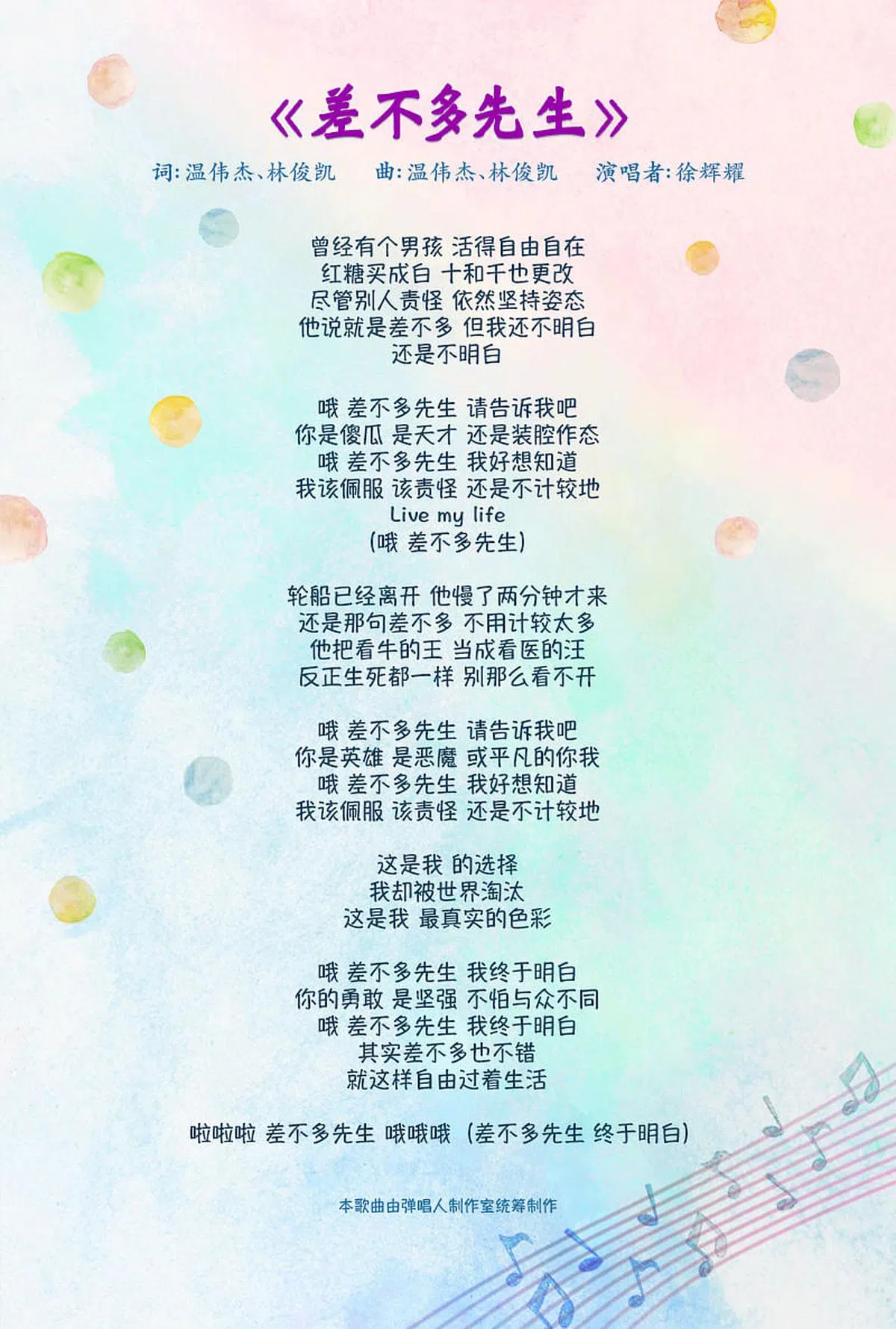 新空下2022创作合辑:《差不多先生》发布/2023年2月12日 07:00小标准中大《差不多先生》词曲是由华侨中学(中学部)的卢冠毅、徐辉耀所创作。 本歌曲由弹唱人制作室统筹制作。所有入选作品的词曲版权归属推广华文学习委员会。浏览新空下专题页面,就可以知道更多相关信息! 新空下全国学生新谣歌唱及创作比赛新谣上一篇新空下2022创作合辑:《邯郸城的斑鸠》下一篇新空下2022创作合辑:《思念很长》