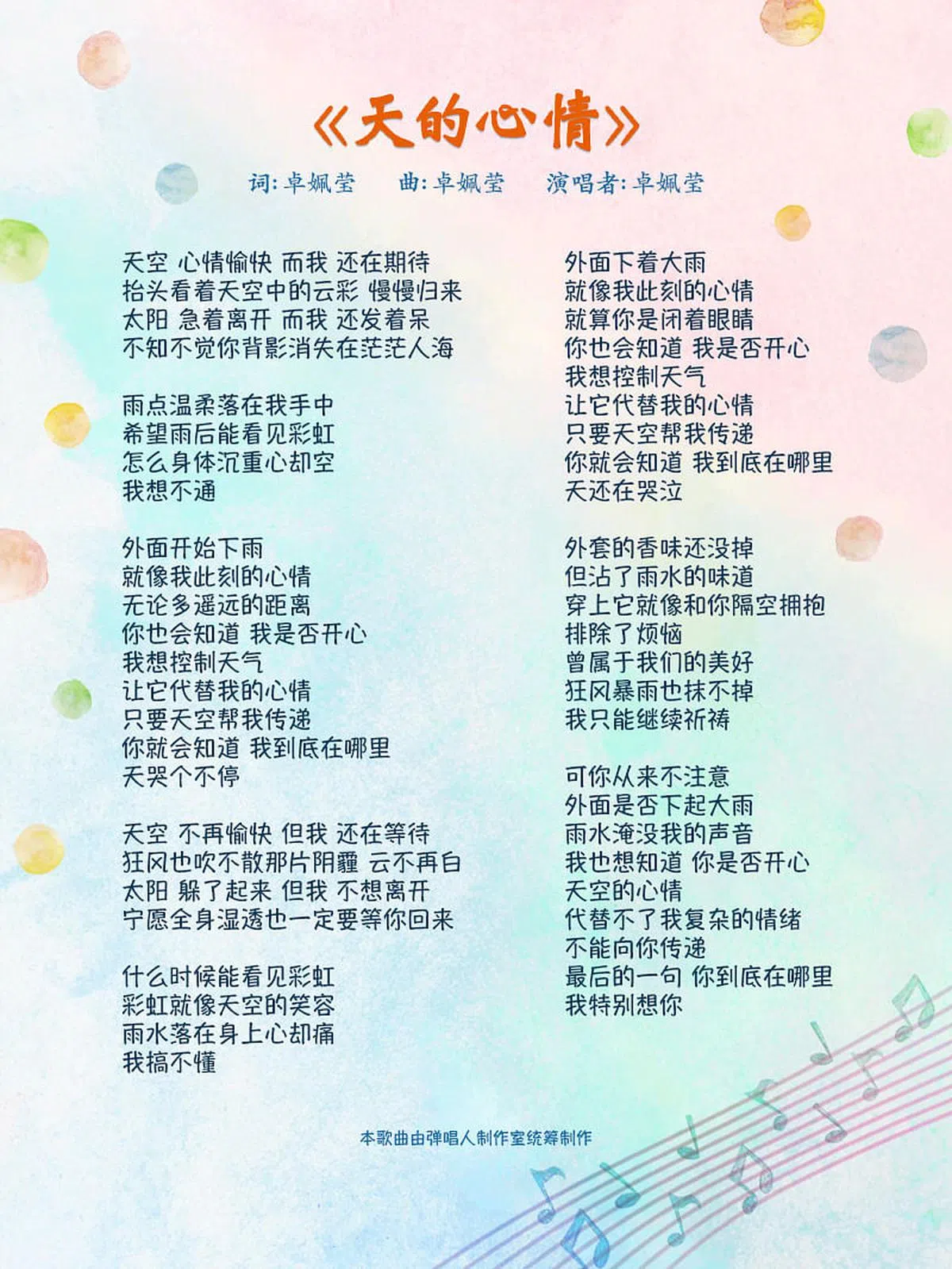 新空下2022创作合辑:《天的心情》发布/2023年2月16日 07:00小标准中大《珍惜现在你所拥有的》词曲是由德明政府中学的卓姵莹所创作。 本歌曲由弹唱人制作室统筹制作。所有入选作品的词曲版权归属推广华文学习委员会。浏览新空下专题页面,就可以知道更多相关信息! 新空下全国学生新谣歌唱及创作比赛新谣上一篇新空下2022创作合辑:《珍惜现在你所拥有的》下一篇新空下2022创作合辑:《筑梦》