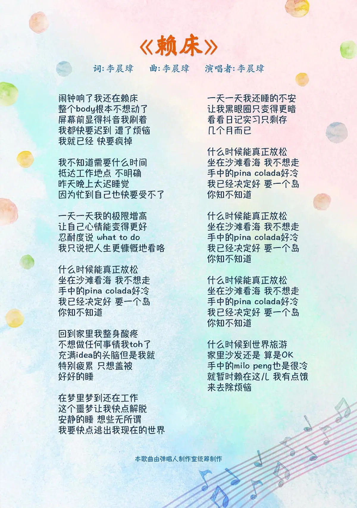 新空下2022创作合辑:《赖床》发布/2023年2月18日 07:00小标准中大《赖床》词曲是由新加坡理工学院的李晨瑋所创作。 本歌曲由弹唱人制作室统筹制作。所有入选作品的词曲版权归属推广华文学习委员会。浏览新空下专题页面,就可以知道更多相关信息! 新空下全国学生新谣歌唱及创作比赛新谣上一篇新空下2022创作合辑:《筑梦》下一篇新空下2022创作合辑:《知多知少》