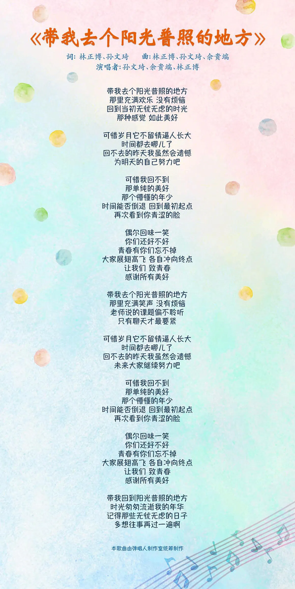 新空下2022创作合辑:《带我去个阳光普照的地方》发布/2023年2月22日 07:00小标准中大《带我去个阳光普照的地方》是由新加坡理工学院的林正博、孙文琦作词,林正博、孙文琦、佘贵端作曲。 本歌曲由弹唱人制作室统筹制作。所有入选作品的词曲版权归属推广华文学习委员会。浏览新空下专题页面,就可以知道更多相关信息! 新空下全国学生新谣歌唱及创作比赛新谣上一篇日本经典漫画《灌篮高手》搬上大银幕 热血追梦故事打动跨世代下一篇新空下2022创作合辑:《畅想未来》