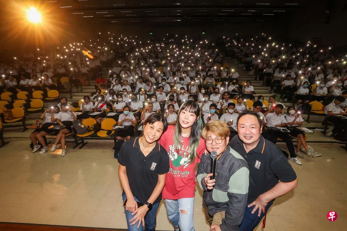 手机照明灯亮起,约600名学生随着音乐徐徐摆动——这是星期四(2月23日)在裕廊先驱初级学院讲堂举办的首场“新空下”新谣音乐分享会的温馨片段。裕廊先驱初级学院高一生济济一堂,感受新谣的现场魅力。弹唱人“新声代”歌手张嘉思和黄铃贻在台上演唱历届“新空下”优胜歌曲,也以过来人身份鼓励学生通过参加“新空下”勇敢追梦。