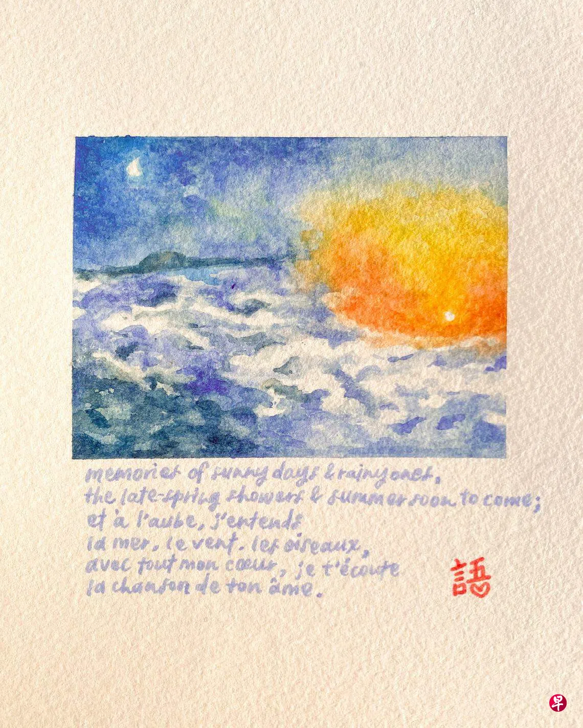 然而,尽管单独沉醉于寂静,也不会感到寂寞,因为皎洁的新月,也正在默默地守夜。在各地不同角落的夜班族群及夜行动物,也还没踏入梦乡。凌晨3点,我彻夜难眠,起身出门,往山路步行。起初,我害怕黑暗,月色朦胧时,只能看到树林的轮廓,却看不见自己的影子。或许我怕的不是黑暗,而是不知道夜晚会延续多久。我开始盼望日出的时刻,我渴望光的温暖。