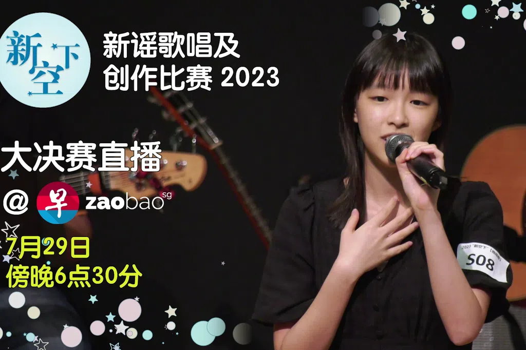 2023“新空下”新谣歌唱及创作比赛(大决赛)直播2023“新空下”大决赛将在今天(7月29日)傍晚6时30分揭开序幕,《联合早报》脸书、zaobao.sg及早报逗号脸书将同步直播! 比赛分为五个组别:歌唱组(合唱)、歌唱组(独唱)、创作组(创意)、创作组(公开)以及歌曲填词组。谁会在大决赛中过关斩将脱颖而出,成为今年“新空下”赢家?让我们拭目以待! “新空下”新谣歌唱及创作比赛由推广华文学习委员会主办,弹唱人制作室、《联合早报》和裕廊先驱初级学院联办。想了解更多详情,可浏览“新空下”专题页面。 延伸阅读 2023“新空下”大决赛 隔空也能感受新谣魅力 2023“新空下”大决赛名单公布 新空下推广华文学习委员会新谣上一篇女儿写诗 小寒是最严格的读者下一篇“新空下”2023得奖名单购买此文章