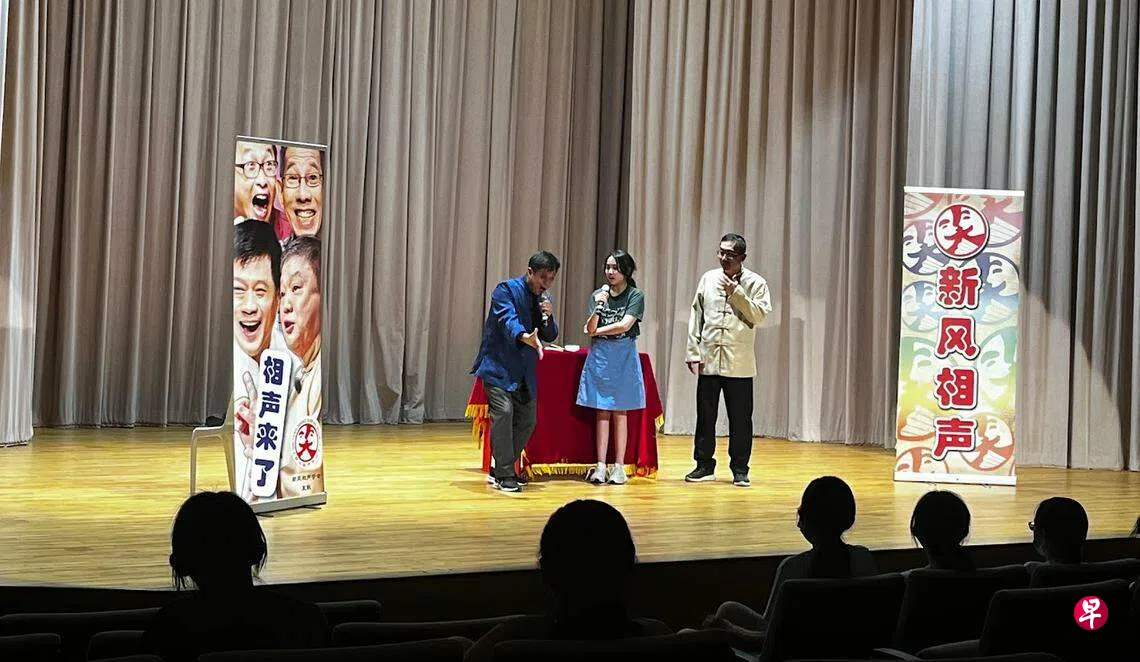 2023年10月10日,新加坡女子小学小六学生和立化中学高一学生一起观赏“相声来了2023”。这场贴近生活的相声表演旨在鼓励学生更深入了解本地相声文化,同时对新加坡相声学会表示支持。75分钟的表演包括三种不同类型的相声:群口、单口和对口相声,现场笑声不断,气氛非常热烈、活跃。