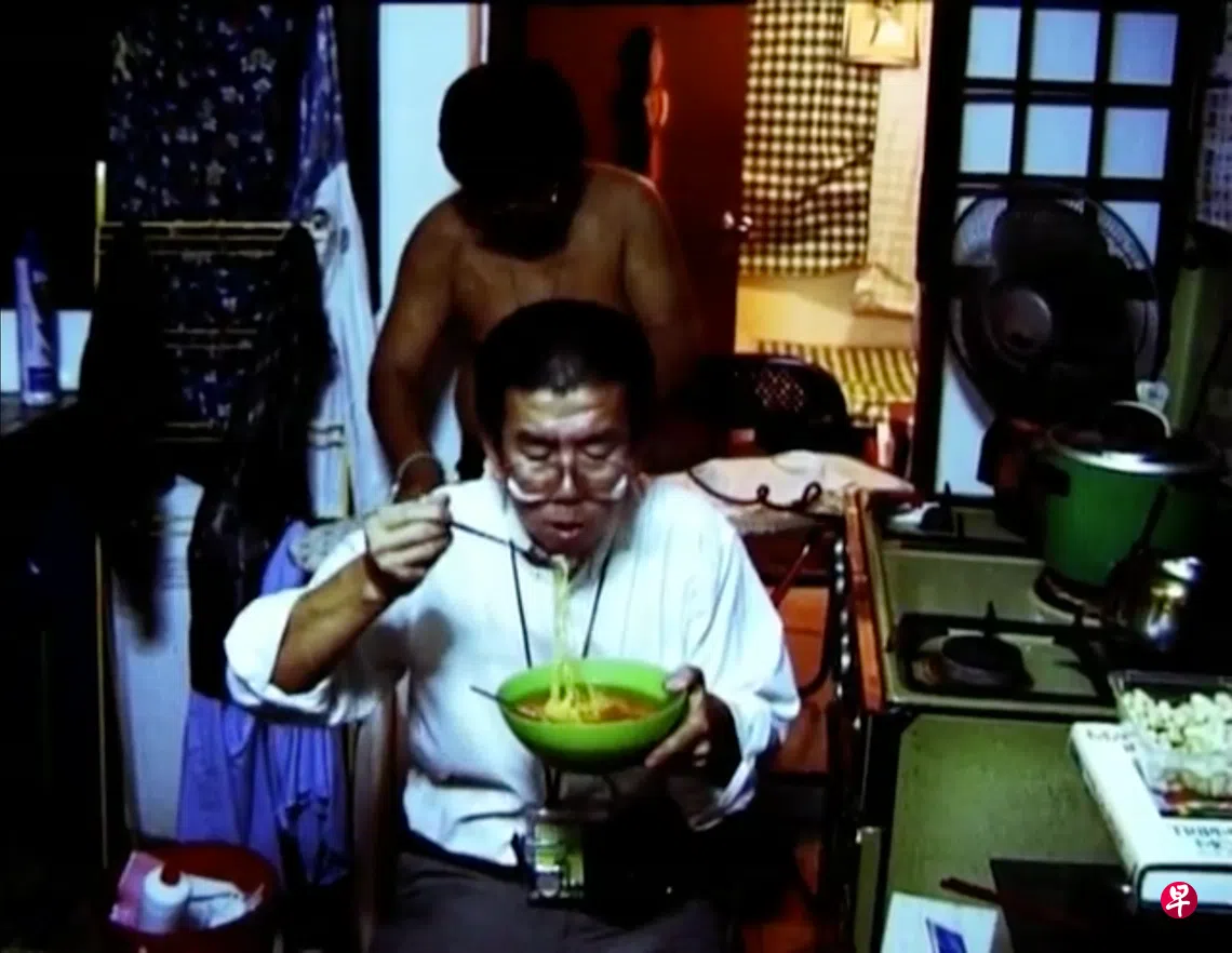 紧接着是卓海隆返家,与哥哥待在家里的画面。卓海隆在前景吃泡面,哥哥在后景熨衣服,更后面的墙壁上挂着哥哥年轻时候的样子,那时的他还未像此刻臃肿,是个未来充满希望的年轻人。这个画面停留在我的脑海成为这部电影核心的瞬间,是一种年轻理想与臃肿变形的现实的强烈对比。