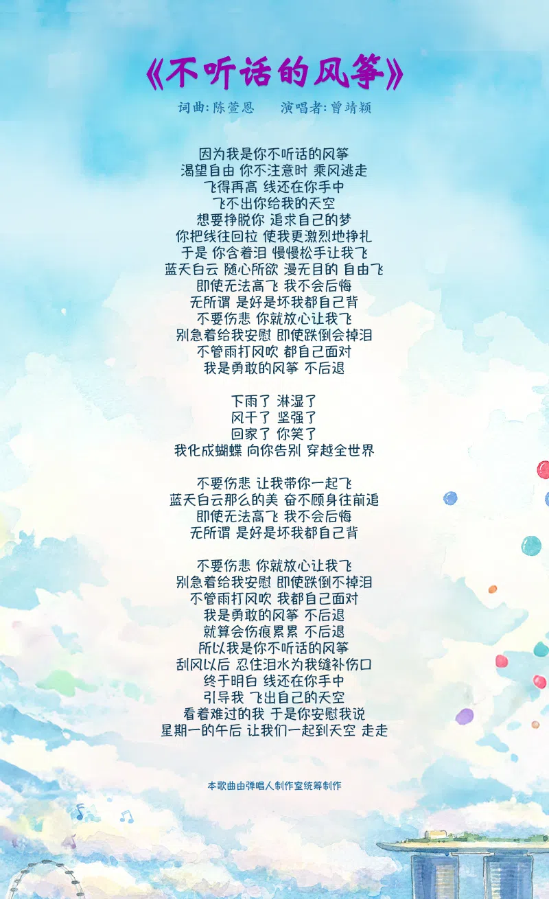 新空下2023创作合辑:《不听话的风筝》发布/2024年3月29日 07:00小标准中大《不听话的风筝》的词曲是由莱佛士女中的陈萱恩所创作。 本歌曲由弹唱人制作室统筹制作。所有入选作品的词曲版权归属推广华文学习委员会。浏览“新空下”专题页面,就可以知道更多相关信息! 新空下新谣上一篇【取火】陈思洁:反脆弱下一篇十年“新空下” 回首来时路购买此文章