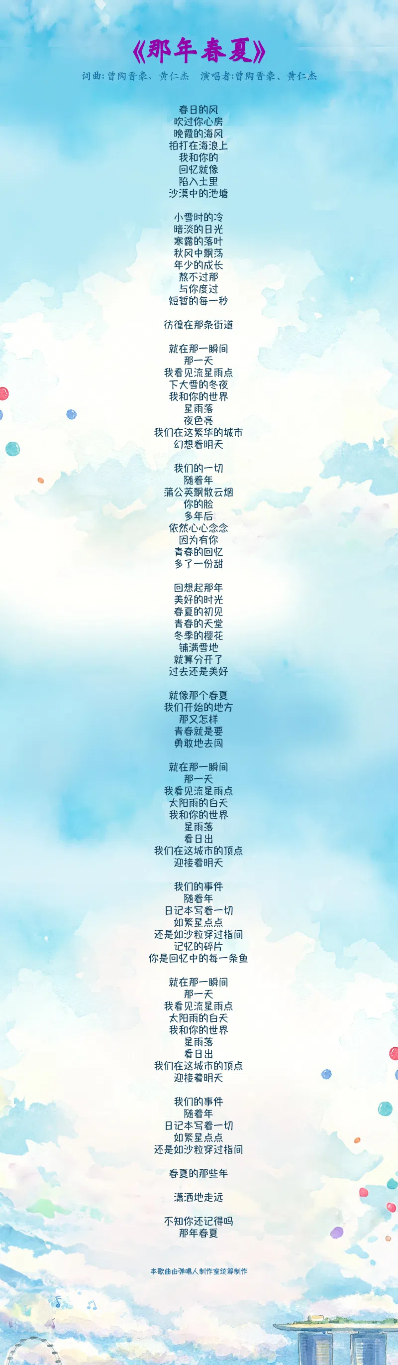 新空下2023创作合辑:《那年春夏》发布/2024年4月1日 07:00小标准中大《那年春夏》的词曲是由华侨中学(中学部)的曾陶晋豪、黄仁杰所创作。 本歌曲由弹唱人制作室统筹制作。所有入选作品的词曲版权归属推广华文学习委员会。浏览“新空下”专题页面,就可以知道更多相关信息! 新空下新谣上一篇新空下2023创作合辑:《茶王》下一篇2024年“新空下”新谣歌唱及创作比赛 章程及规则购买此文章