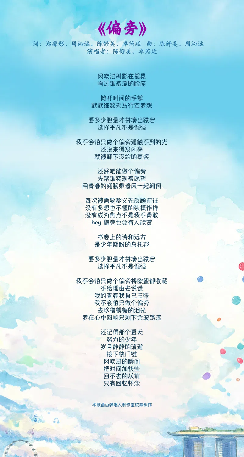 新空下2023创作合辑:《偏旁》发布/2024年4月4日 07:00小标准中大《偏旁》是由裕廊先驱初级学院的馨彤、周沁远、陈舒美、卓芮廷作词,陈舒美、周沁远作曲。 本歌曲由弹唱人制作室统筹制作。所有入选作品的词曲版权归属推广华文学习委员会。浏览“新空下”专题页面,就可以知道更多相关信息! 新空下新谣上一篇拍短视频为国家队打气 理工生聚焦镜头外的他们下一篇【取火】杨培铎:彷徨的海棠购买此文章