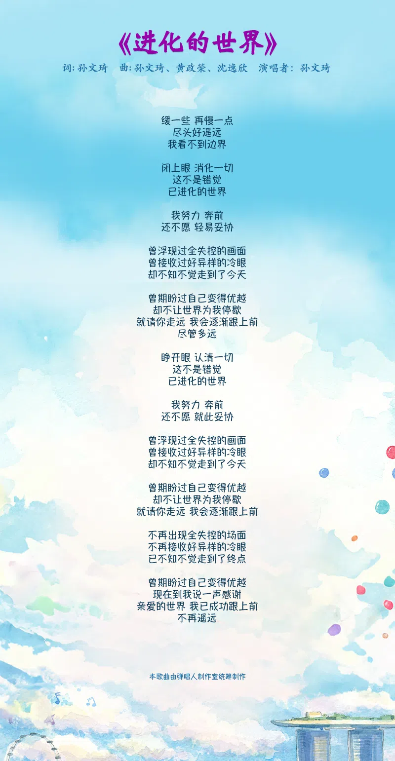 新空下2023创作合辑:《进化的世界》发布/2024年4月6日 07:00小标准中大《进化的世界》是由南洋理工大学的孙文琦作词,南洋理工大学的孙文琦、新加坡理工学院的黄政榮和沈逸欣作曲。 本歌曲由弹唱人制作室统筹制作。所有入选作品的词曲版权归属推广华文学习委员会。浏览“新空下”专题页面,就可以知道更多相关信息! 新空下新谣上一篇新空下2023创作合辑:《少年,你好吗?》下一篇新空下2023创作合辑:《变化》购买此文章