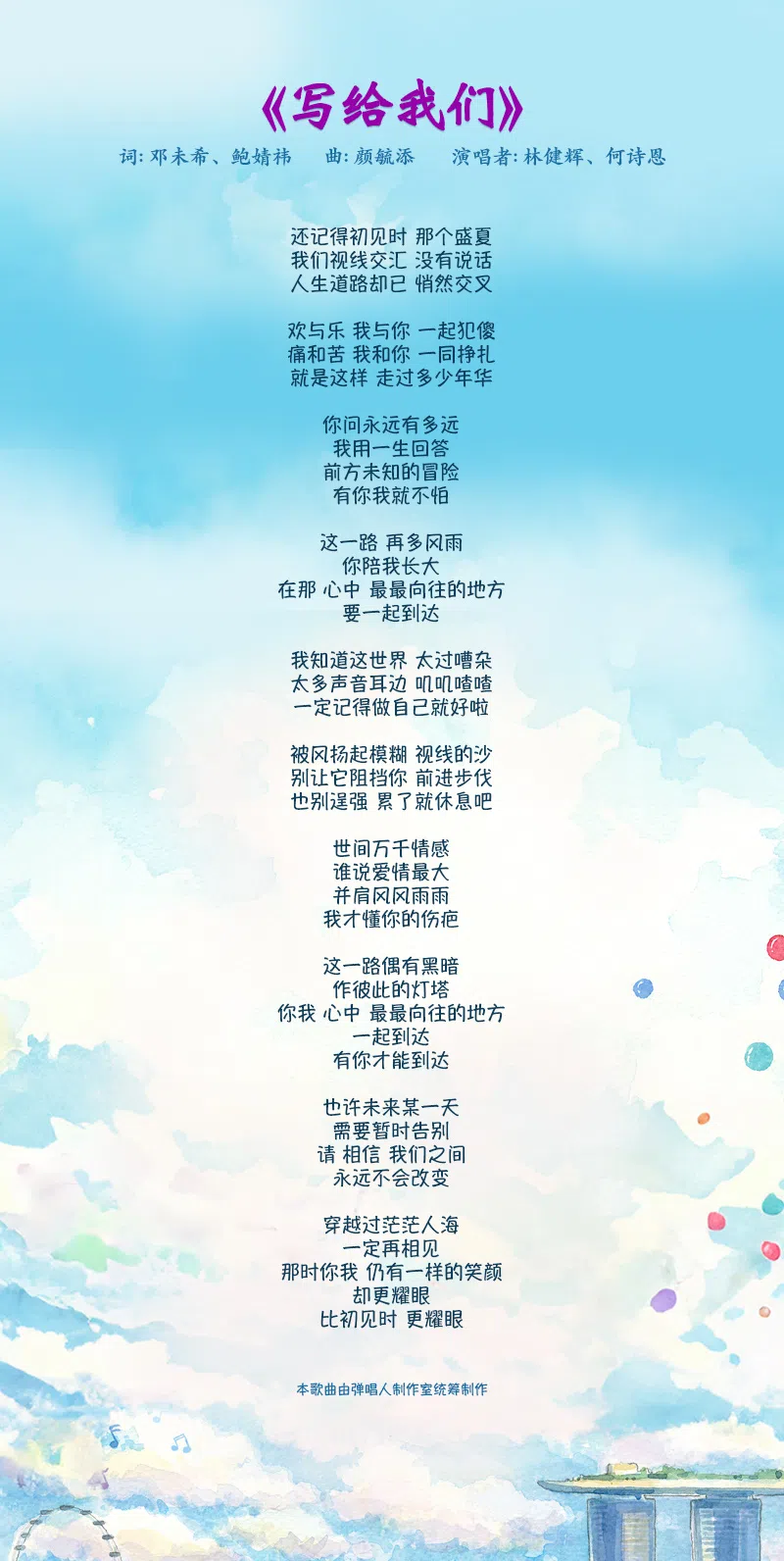 新空下2023创作合辑:《写给我们》发布/2024年4月9日 07:00小标准中大《写给我们》的词曲是由安德逊实龙岗初级学院的邓未希、鲍婧祎作词,本地资深创作人颜毓添作曲。 本歌曲由弹唱人制作室统筹制作。所有入选作品的词曲版权归属推广华文学习委员会。浏览“新空下”专题页面,就可以知道更多相关信息! 新空下新谣上一篇新空下2023创作合辑:《少年》下一篇【字食族】杨培铎:倒影中的雨购买此文章