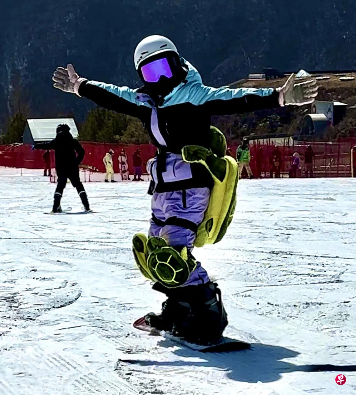 多年的滑板经验虽能让我很好地保持平衡,但如何减速成了难题。因为身上都穿着多个小乌龟护具,我选择依赖摔倒来减缓速度。摔了几次后,我逐渐摸索出将重心前后调整以改变滑行方向的方法,又或者试着将雪板与滑行方向平行以控制速度。在魔毯上来回几次后,我竟然有了挑战更具难度赛道的勇气——回村雪道。