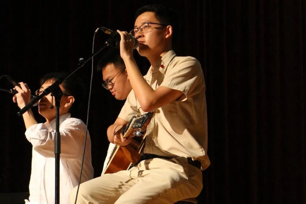 在华侨中学的指定观众区,人头攒动。只见几十名身穿粉色和黑色上衣的人忙碌地在座位之间走动。原来是华中高中部的学生理事会来为师生分发各种助威装备,包括充气式的打气棒和印有华中口号的折叠扇。