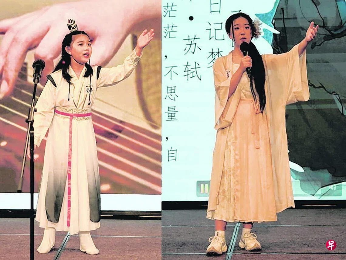 就读静山小学的李庭萱(11岁)去年参加华文诗歌朗诵比赛获得亚军,今年同样也表现出色,再次在高小组夺得亚军。为了这次比赛,李庭萱下了许多功夫,包括服装以及舞台上的呈现。这次参赛遇到考试周,决赛前几周几乎都在准备考试,没有时间排练,但出于对古诗词的热爱,李庭萱还是想办法抽出时间练习。