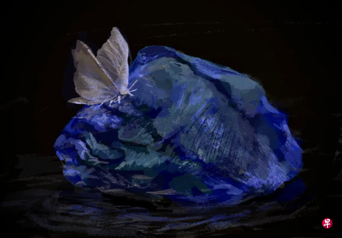 不得不说,那是一块美丽,甚至能称得上是“妖艳”的石头。它透漏着一股犹如海底深渊的沉寂。但它是活的,或者说,它有一种只有生命才有的渴望。那团幽蓝仿佛在跳动,在旋转,在彰显它的生命,以及一团正在燃烧的——欲望。Z捧着那块石头走了回去,两条手臂脏得像是套了两条土黄色的袖子。当他把那块石头放在其他人找到的那些深褐色、橘黄色,以及只有一点点青绿色的石头堆当中时,大家都知道Z是这次的赢家,纷纷投来赞赏的目光。Z开心地笑了,因为自己找到了那块幽蓝色的石头。