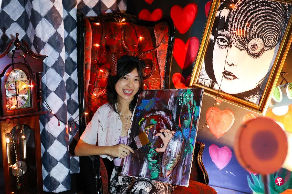 一周后将要迎来万圣节,城中的“僵尸鬼怪、巫婆精灵们”早已蠢蠢欲动,做好准备。对于19岁的林欣梅来说,今年的万圣节有点特别,经过几个月筹备,她的画室Scuro终于开张。与其他充满正能量与艺术氛围感的画室不同,这里提供的是沉浸式恐怖艺术(horror arts)体验,在本地还是第一家。