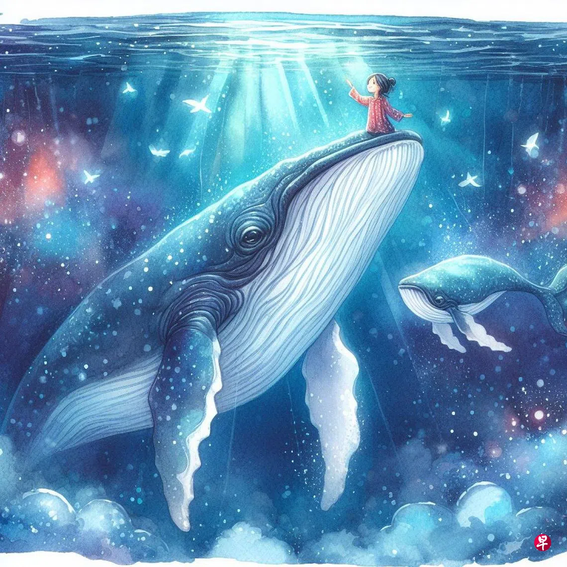 世界突然变得空白,瓶子也不见了。我的手掌轻轻地触碰着鲸鱼的头颅。它的身体放松了下来,不再紧绷、警惕着。我不知道它是谁,但它很熟悉。它像是一个老朋友,一个我认识了很久的人。我抚摸着它,在很久以来第一次在内心感到了一阵松弛的愉悦。我看着面前这头鲸鱼。