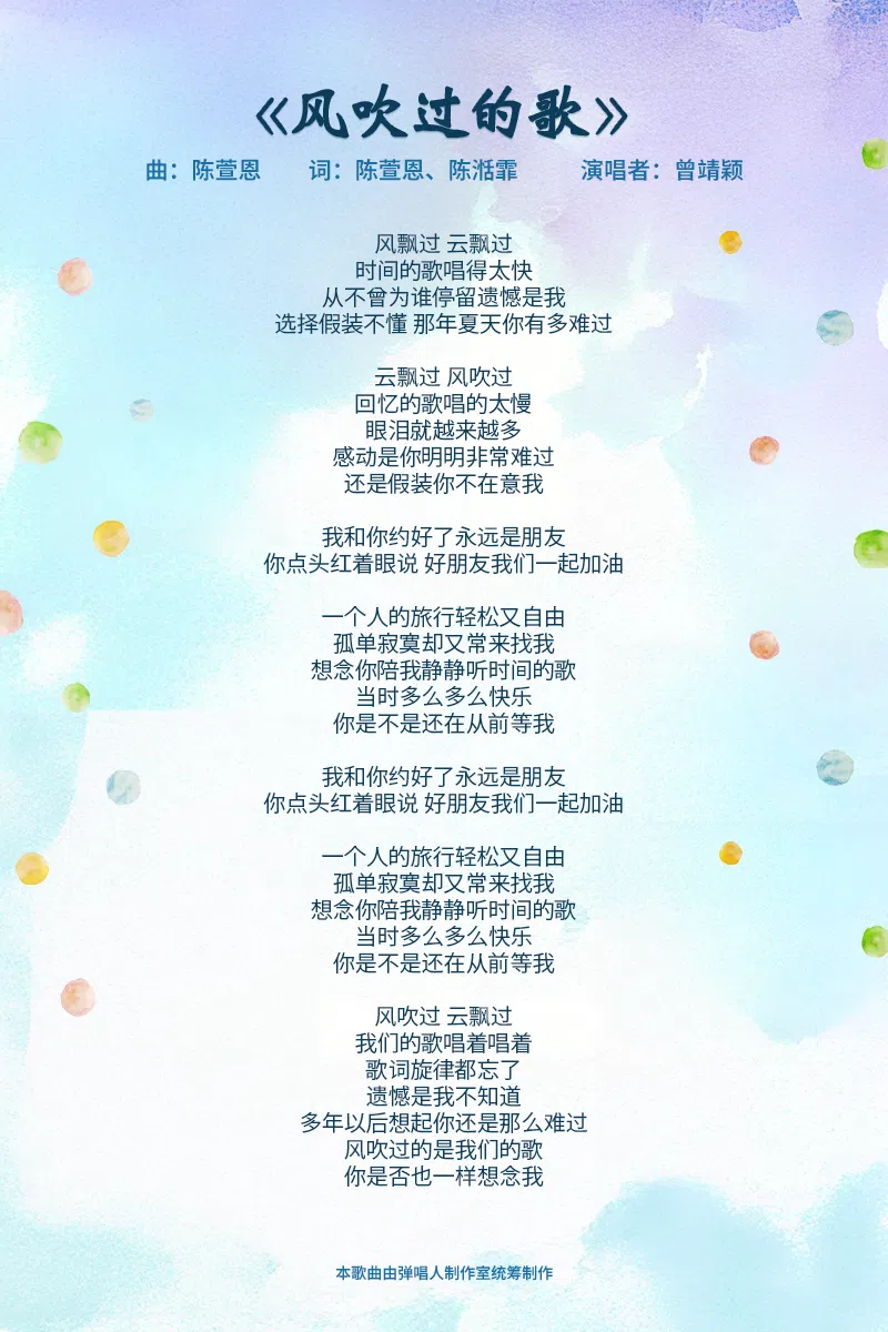 新空下2024创作合辑:《风吹过的歌》发布/2025年3月15日 07:00小标准中大《风吹过的歌》是由莱佛士女中的陈萱恩、华侨中学(高中部)的陈湉霏作词,陈萱恩作曲。 本歌曲由弹唱人制作室统筹制作。所有入选作品的词曲版权归属推广华文学习委员会。浏览“新空下”专题页面,就可以知道更多相关信息! 新空下新谣上一篇【取火】计嘉懿:永恒的守护下一篇新空下2024创作合辑:《亲爱的我》购买此文章