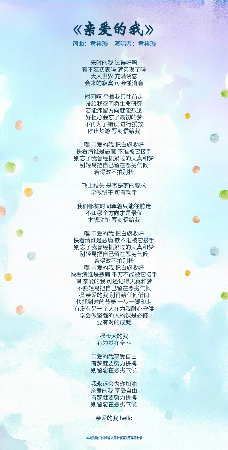 新空下2024创作合辑:《亲爱的我》发布/2025年3月16日 07:00小标准中大《亲爱的我》的词曲是由南洋女子中学的黄裕璇所创作。 本歌曲由弹唱人制作室统筹制作。所有入选作品的词曲版权归属推广华文学习委员会。浏览“新空下”专题页面,就可以知道更多相关信息! 新空下新谣上一篇新空下2024创作合辑:《风吹过的歌》下一篇新空下2024创作合辑:《肆意奔跑》购买此文章