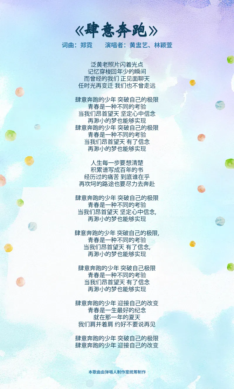 新空下2024创作合辑:《肆意奔跑》发布/2025年3月17日 07:00小标准中大《肆意奔跑》的词曲是由裕廊前驱初级学院的郑霓所创作。 本歌曲由弹唱人制作室统筹制作。所有入选作品的词曲版权归属推广华文学习委员会。浏览“新空下”专题页面,就可以知道更多相关信息! 新空下新谣上一篇新空下2024创作合辑:《亲爱的我》下一篇新空下2024创作合辑:《失而复得》购买此文章