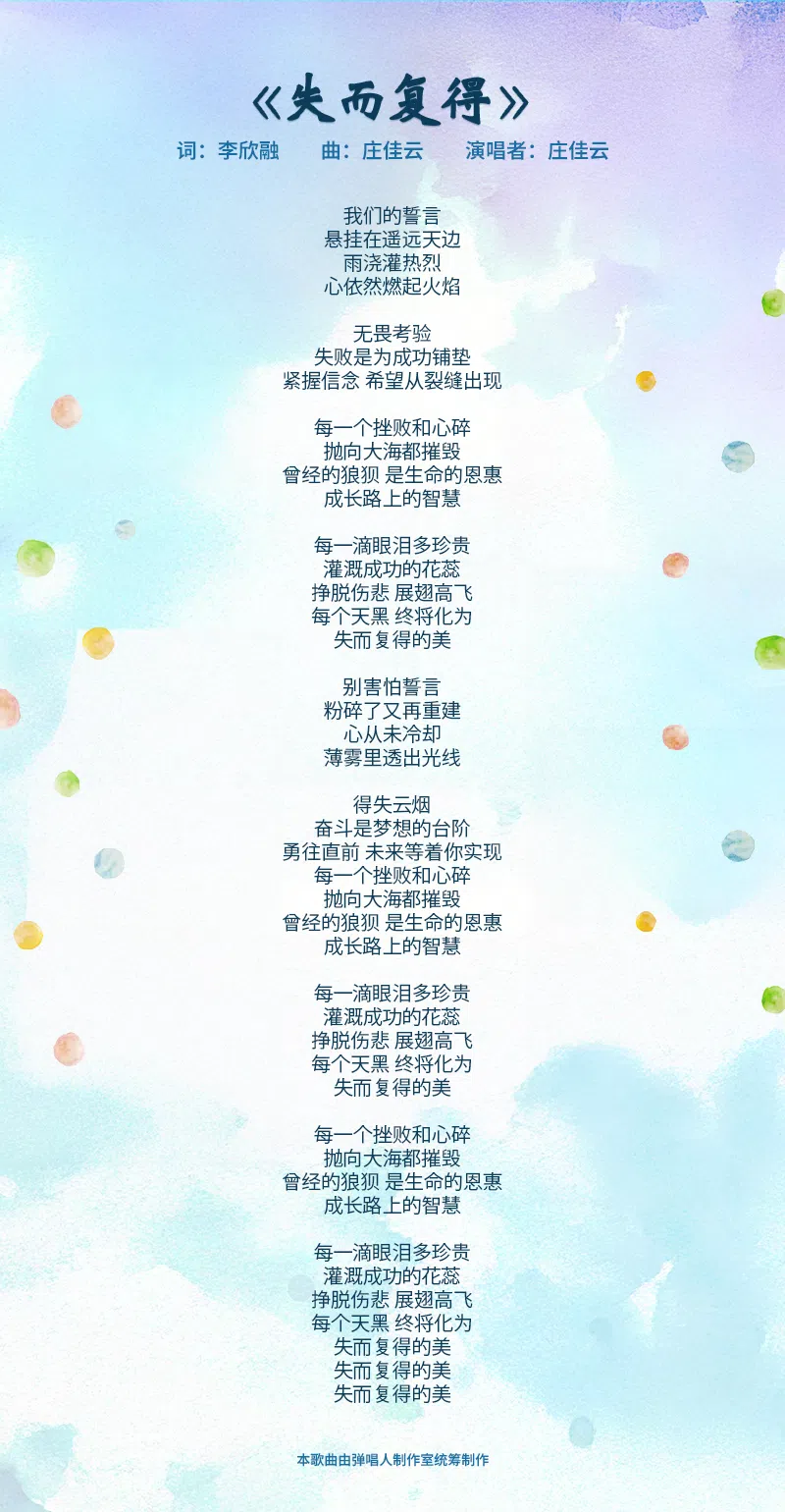 新空下2024创作合辑:《失而复得》发布/2025年3月18日 07:00小标准中大《失而复得》是由新加坡国立大学的李欣融作词,庄佳云作曲。 本歌曲由弹唱人制作室统筹制作。所有入选作品的词曲版权归属推广华文学习委员会。浏览“新空下”专题页面,就可以知道更多相关信息! 新空下新谣上一篇新空下2024创作合辑:《肆意奔跑》下一篇“新空下”2025首场新谣音乐分享会 歌声悠扬绽放青春华光购买此文章