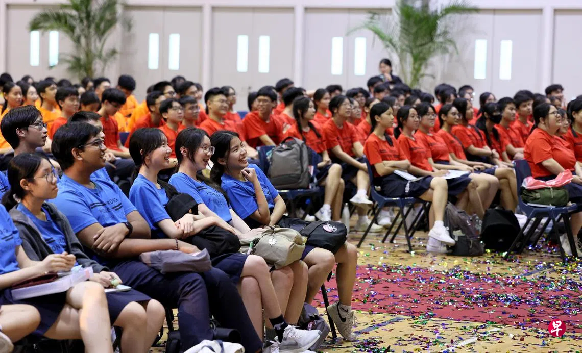 2025年“新空下”第一场新谣音乐分享会3月14日(星期五) 在裕廊先驱初级学院礼堂举行。身穿代表各自色组院服的裕驱初院学生随着音乐轻轻摇摆,跟着节奏为表演者打拍子,沉浸在音乐中。“新空下”全国学生新谣音乐节由推广华文学习委员会联同《联合早报》、弹唱人制作室和裕廊先驱初级学院共同举办。