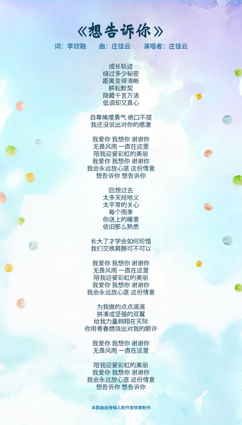 新空下2024创作合辑:《想告诉你》发布/2025年3月23日 07:00小标准中大《想告诉你》是由新加坡国立大学的李欣融作词,庄佳云作曲。 本歌曲由弹唱人制作室统筹制作。所有入选作品的词曲版权归属推广华文学习委员会。浏览“新空下”专题页面,就可以知道更多相关信息! 新空下新谣上一篇《取火》特别企划:100年前出生的三岛由纪夫,100年后我们想到他的是?下一篇新空下2024创作合辑:《这一路走来》购买此文章