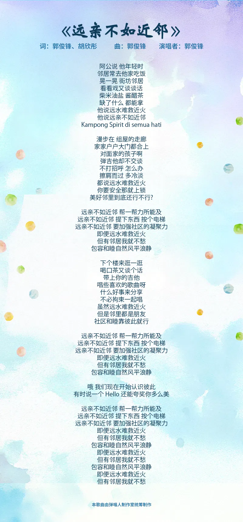 新空下2024创作合辑:《远亲不如近邻》发布/2025年3月26日 07:00小标准中大《远亲不如近邻》是由华侨中学(中学部)的郭俊锋、华侨中学(高中部)的胡欣彤作词,郭俊锋作曲。 本歌曲由弹唱人制作室统筹制作。所有入选作品的词曲版权归属推广华文学习委员会。浏览“新空下”专题页面,就可以知道更多相关信息! 新空下新谣上一篇【校果】华中户外教育选拔营 拥抱逆境熔炼团队精神下一篇李心仪:所到之处购买此文章