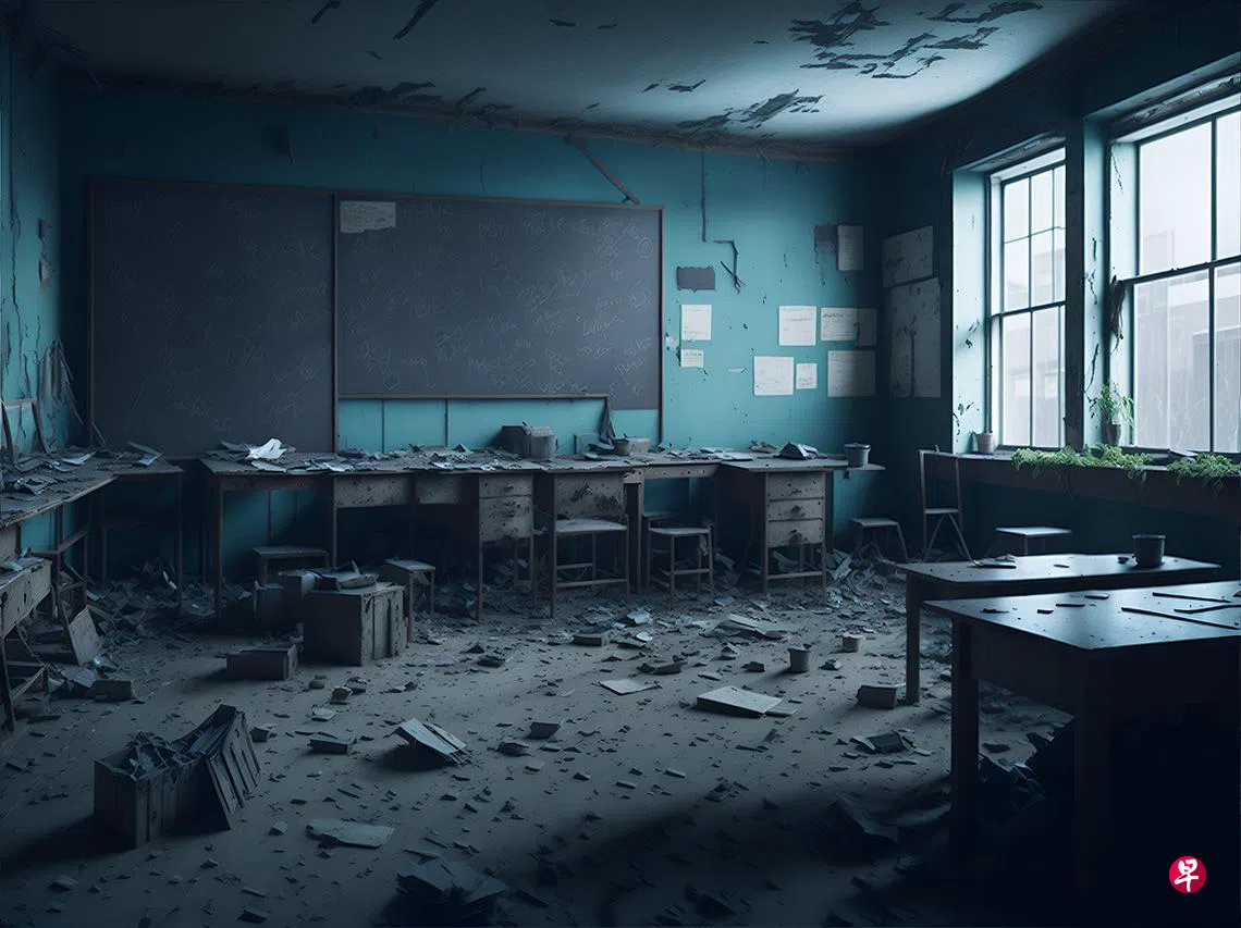我的那位同学被罚到放学后很久才让离开。那时候学校里已经没几个人了,天色向晚,学校里一片昏黄。他回教室收拾书包,冷不丁地听到“咔”的一声,转头一看,发现门自己开了。他喊了几声,发现没人,赶紧把东西塞进书包里打算趁早离开。这时窗户又突然“啪”地一下,直接被风吹开了,而后狂风大作呜呜地叫个不止。这可真把他吓着了,也顾不上许多了拎起书包就是跑,跑到楼道上后发现后头有东西发出脚步声在追,于是飞速地往楼梯口逃。
