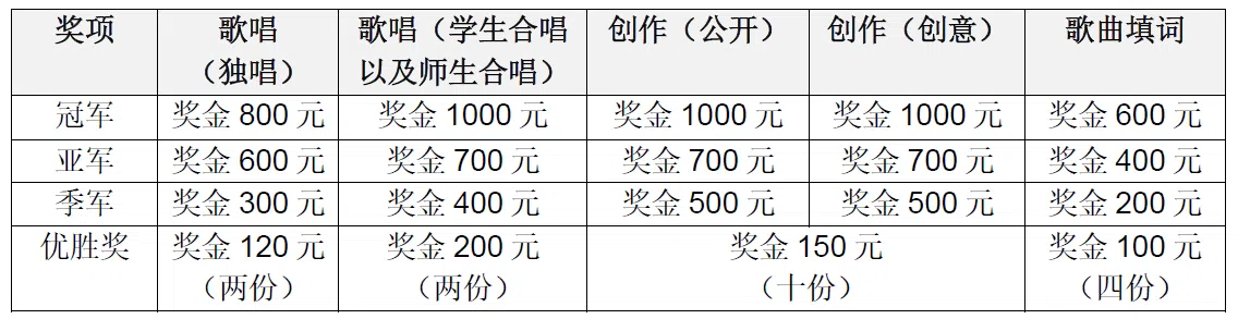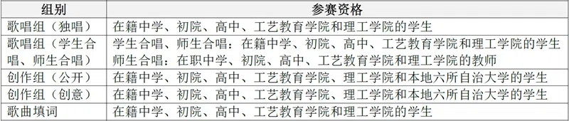 今年的比赛共分五个组别:歌唱组(独唱)、歌唱组(学生合唱以及师生合唱)、创作组(公开)、创作组(创意),以及歌曲填词组。