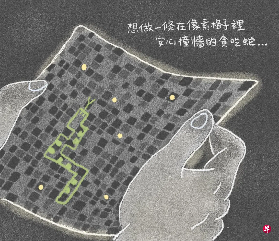 不知是认知的加深,还是因为拥有了能掌握世界讯息的渠道,我感受到了此时世界的动荡不安。那不像是因为距离能削弱的,也不像是年幼时大人语气渲染出的间接恐慌,无孔不入的一次次震荡使得感官甚至有些麻木。“简直见证历史!” 近五年最常听到的感叹,世界不再是我难以窥探到的庞然大物,反而紧密得像是稍有动静,波纹便会蔓延及脚下的焦虑。这似乎不是我可以闭上眼睛,等待一场烟花掩盖恐惧的时代了,我想说我更喜欢贪吃蛇被困在小小方框里的那个年代,但或许那只是它/我的一种保护机制。世界从未平稳过,五厘米大小的方框,书桌的四角,再是家门的门槛,都是自我设定的安全边界,只要不越界,危险便能被拒之门外的假象也会有模糊的一天。