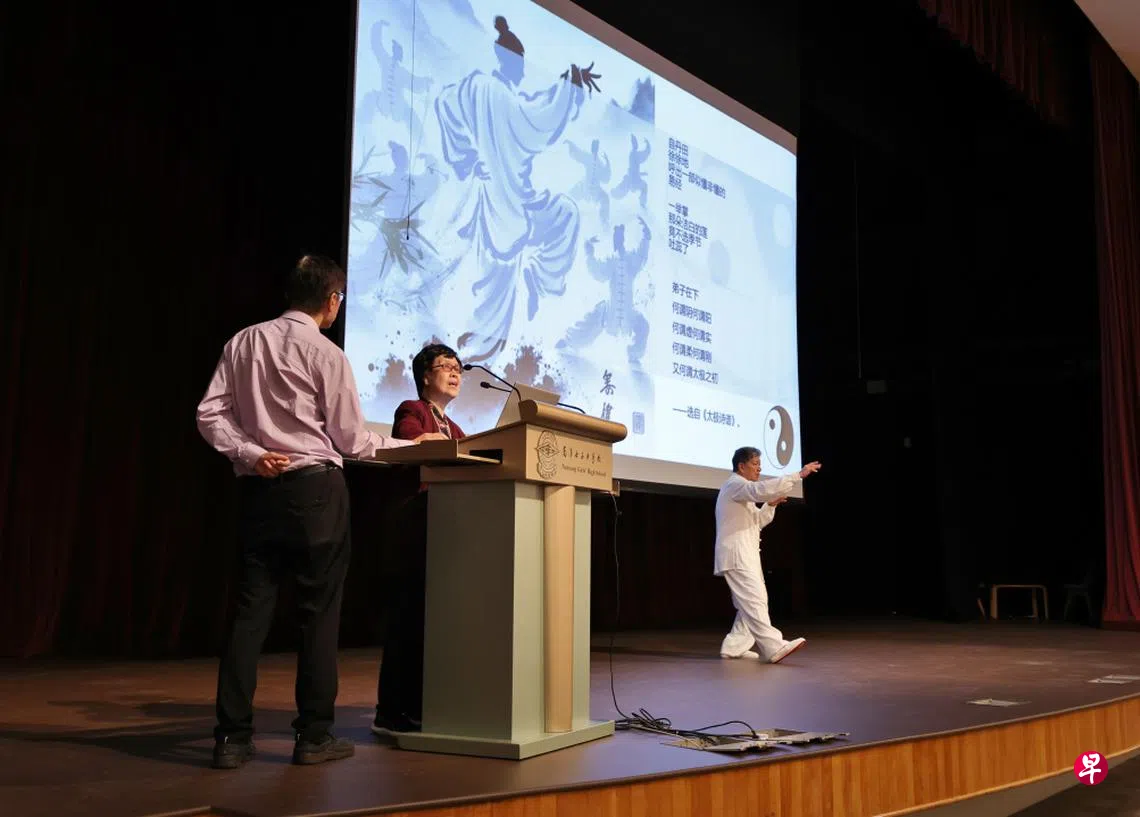 为配合新加坡建国60周年,本届论坛以“本地书写·本土情”为主题,聚焦本土文学创作。活动特邀两位本地资深作家——王润华教授与淡莹担任主讲嘉宾。两位诗人结合自身创作经历,分享了写作灵感与技巧,并鼓励学生从生活细节中寻找创作素材。淡莹还现场朗诵了自己关于太极的诗作,并特别邀请了从柔佛新山特地开车过来的黄建成作为嘉宾配合表演太极拳。黄建成是马来西亚资深报人,新山永年太极拳学会创办人兼教练,杨式太极拳第六代传承人。他所带来的太极表演可谓锦上添花,为淡莹的诗增添了画面感,不仅方便学生理解诗作,也让文学与艺术相映成趣,现场氛围诗意盎然。
