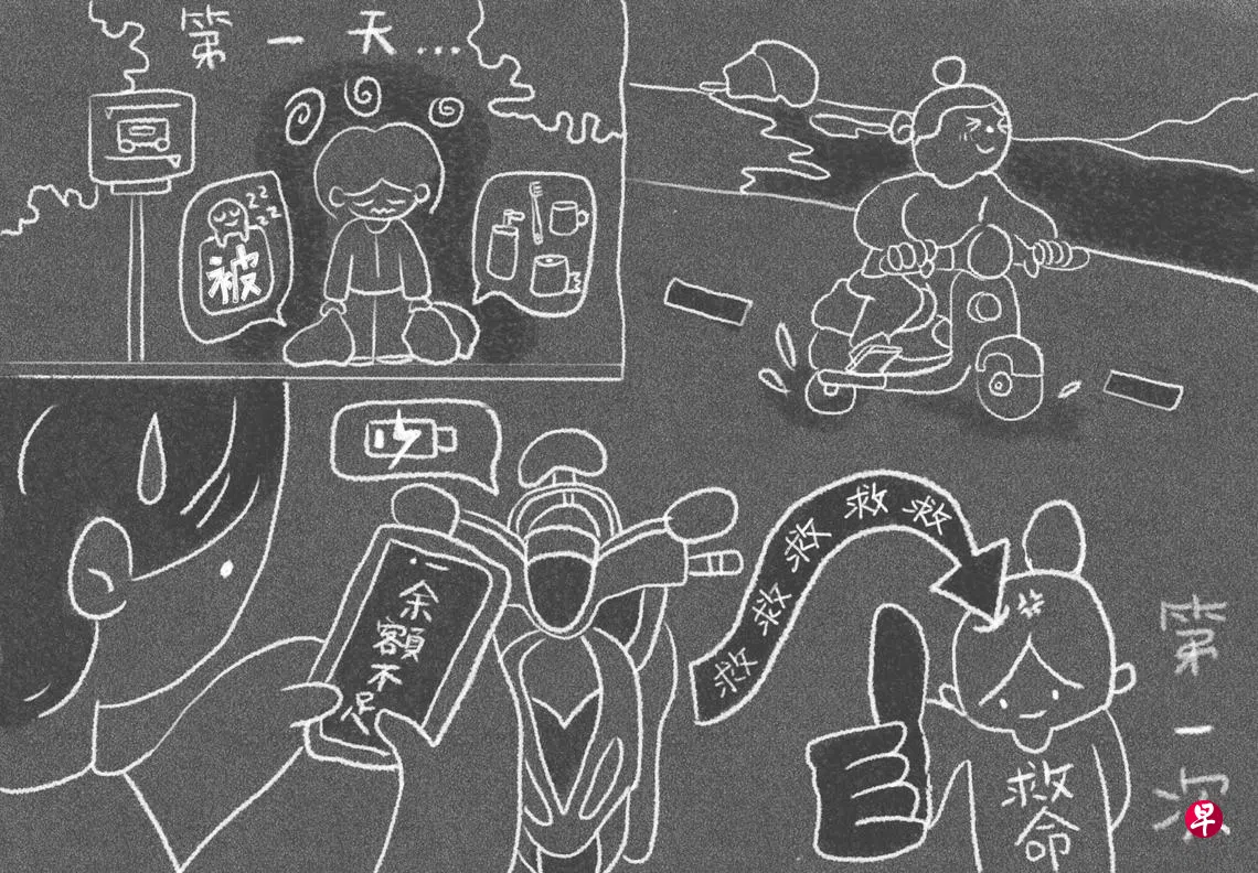 交换的末段,自以为已磨练成了任何情况下都能从容不迫应对的“一个人专家”,但还是低估了生活编写剧本的能耐。独自出发,在某海岛租了两日的电动机车,打算吹吹海风来一场惬意的环岛旅行,但却像是触发了什么接二连三的倒霉机制,把我“专家”的人设打碎。租车的时候,车行老板信誓旦旦地保证车已经充满能连骑两日的电量,我也信以为然,试骑了一小段路也没什么事,就上路了。