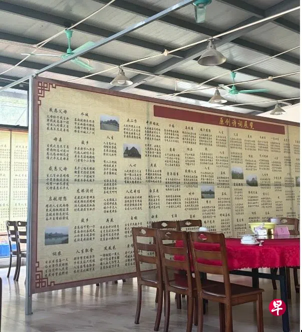 还未有时间细细品读四字经,农庄老板便出来迎客,将我们领到了座位,点了招牌窑鸡和几道家常菜,老板笑脸盈盈地让我们稍作等待,便匆匆进厨房烧菜去了。整个用餐大堂被十几个覆满诗词的隔板隔离开来,仿佛我们走进的不是什么窑鸡农庄而是诗词大会现场, 我和朋友面面相觑, 难道我们误入了?