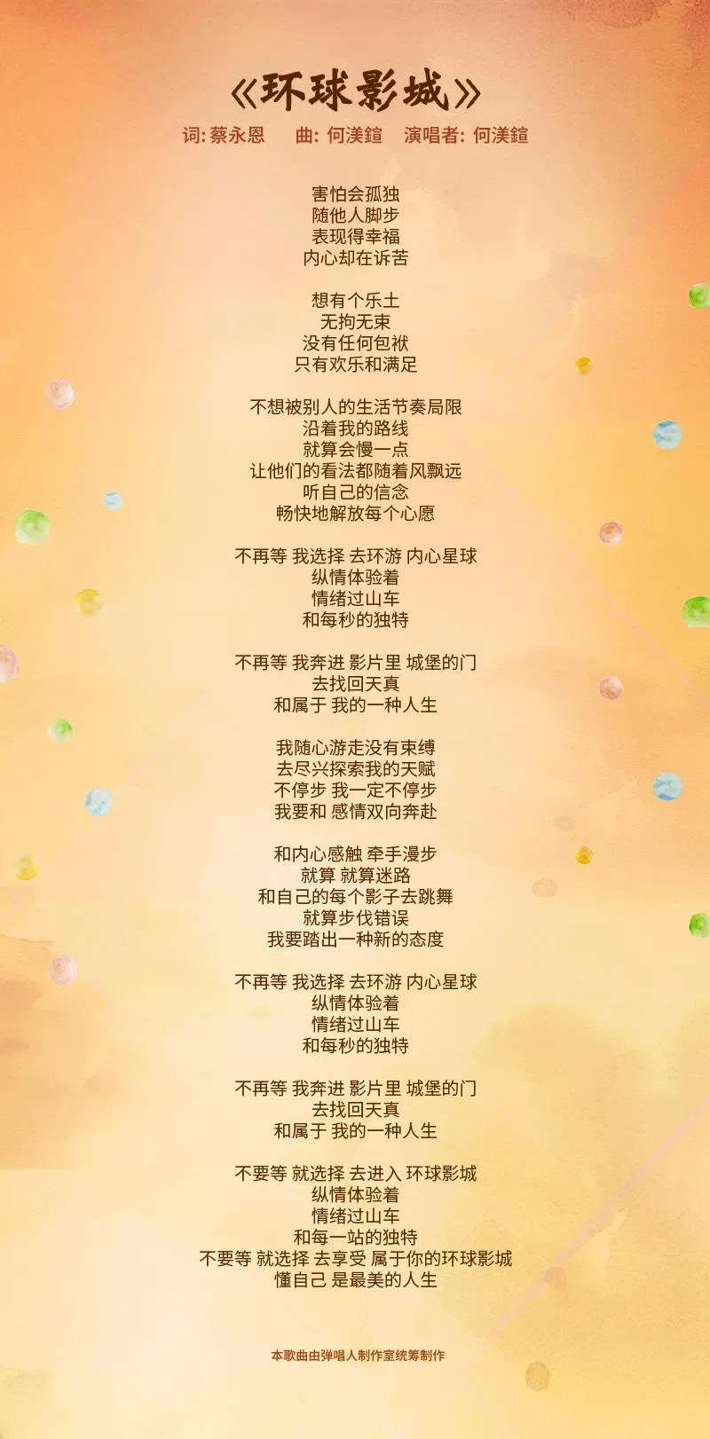 新空下2025创作合辑:《环球影城》《环球影城》是由圣尼各拉女校的蔡永恩作词,新加坡艺术学院的何渼鍹作曲。 本歌曲由弹唱人制作室统筹制作。所有入选作品的词曲版权归属推广华文学习委员会。浏览“新空下”专题页面,就可以知道更多相关信息! 新空下新谣上一篇【阿单手帐】周佳铃:大学生效率自救指南:我的六个实用小技巧下一篇新空下2025创作合辑:《小鱼》购买此文章