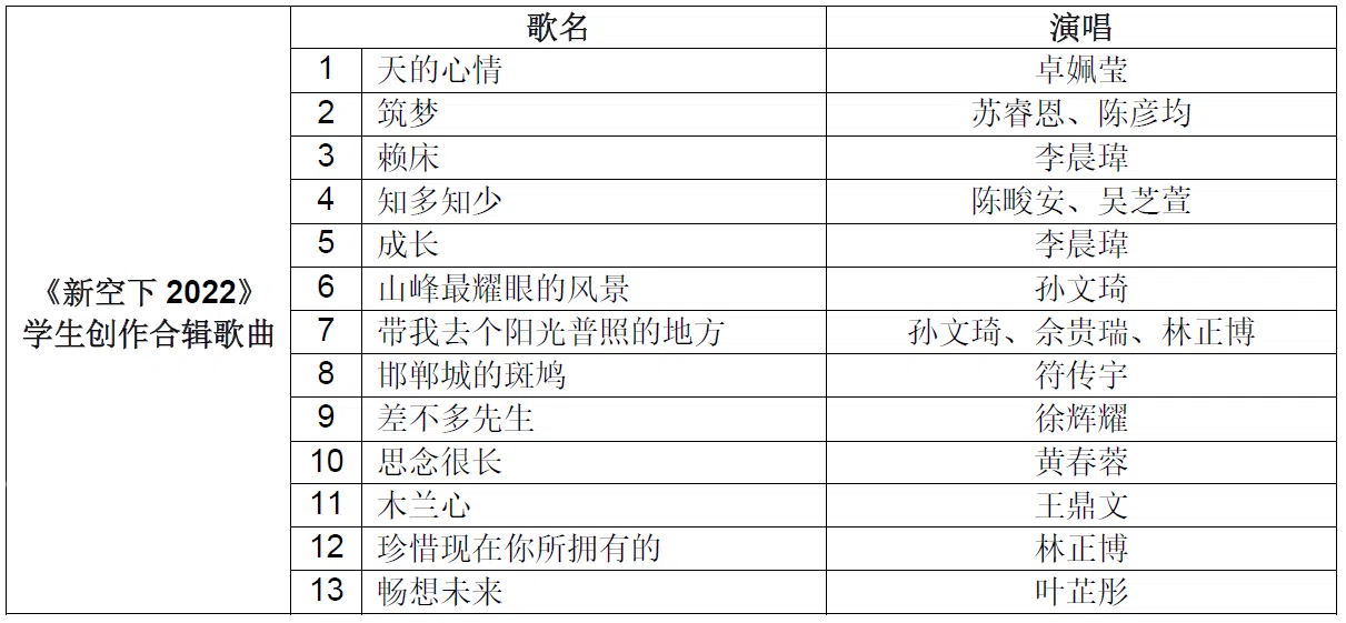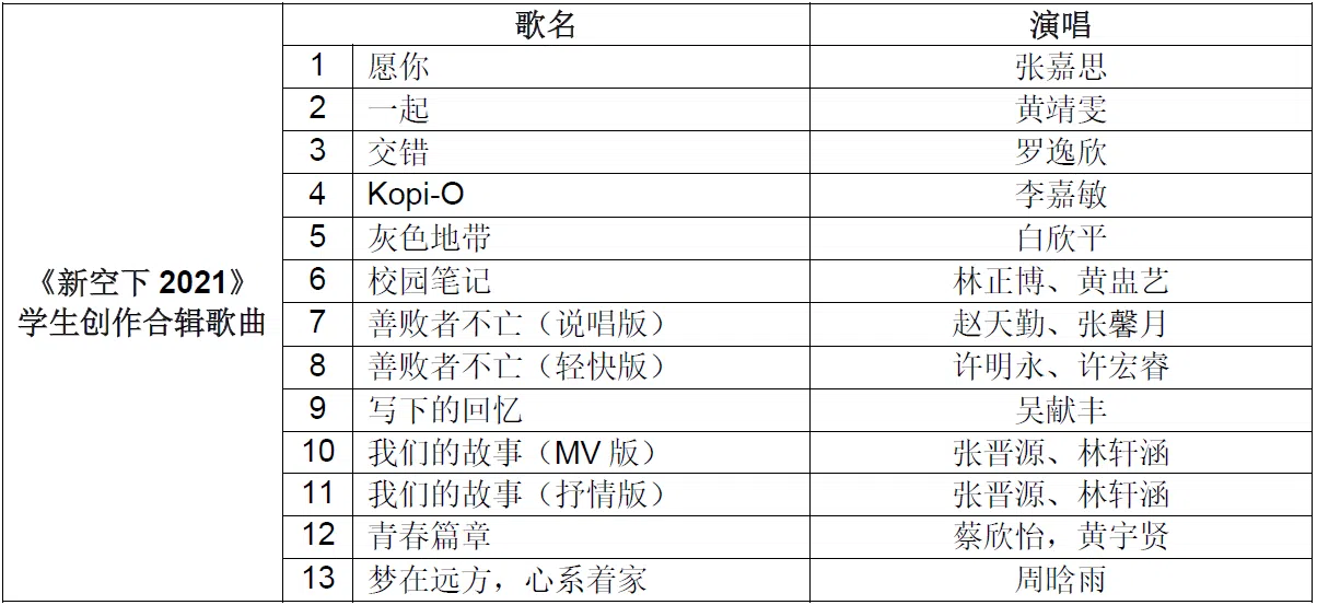 初赛以及半决赛选唱歌曲需参考附件二中的指定歌曲,其中包括:新加坡自上世纪80年代开始流传的本地新谣歌曲、《新空下》学生创作合辑中的作品,以及2021中学华文课程主题曲《华文伴我行》。