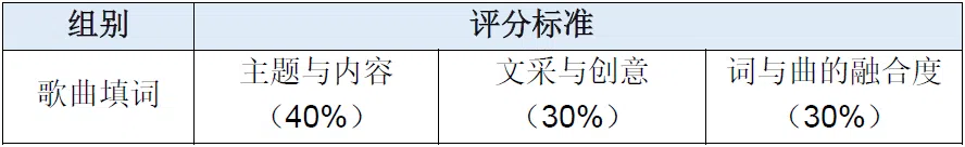 今年的比赛共分五个组别:歌唱组(独唱)、歌唱组(学生合唱以及师生合唱)、创作组(公开)、创作组(创意),以及歌曲填词组。比赛章程及规则如下:
