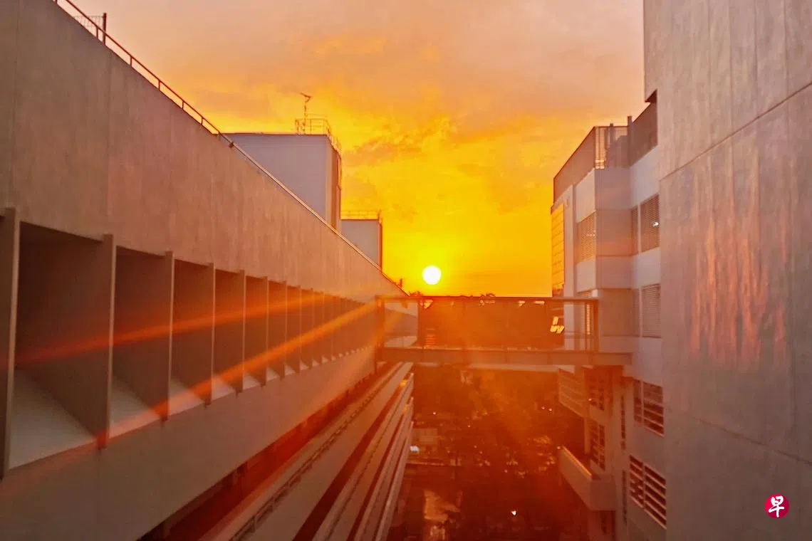 夕阳正慢慢落下,橙黄色的光夹在教学楼之间,圆圆的一团,像一个快要掉下去的蛋黄。其实也算是一场非常普通的日落吧,可似乎能够把原本急着往前走的傍晚,硬生生拉慢了下来。没有人开口催促,我们只是站在那里,静静地看着那轮落日一点一点地往下沉,最后慢慢被教学楼藏起来。