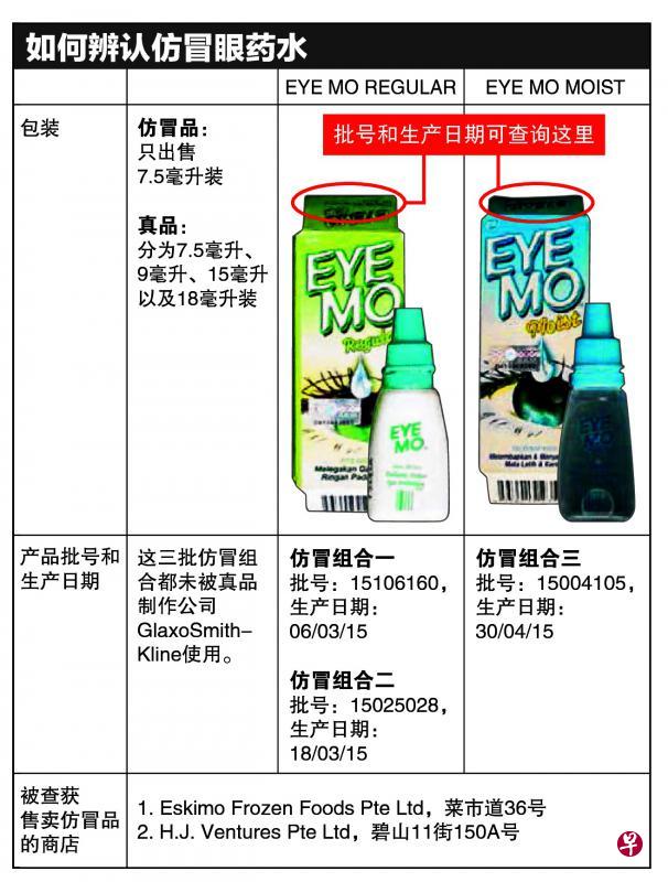 卫生科学局劝请消费者立即查询EYE MO眼药水瓶装上印有的批号和生产日期,确定产品是否为仿冒品。若怀疑产品为仿冒产品,应立即扔掉,也可发电邮到sg.customer-relations@gsk.com或拨打1-8006227238。