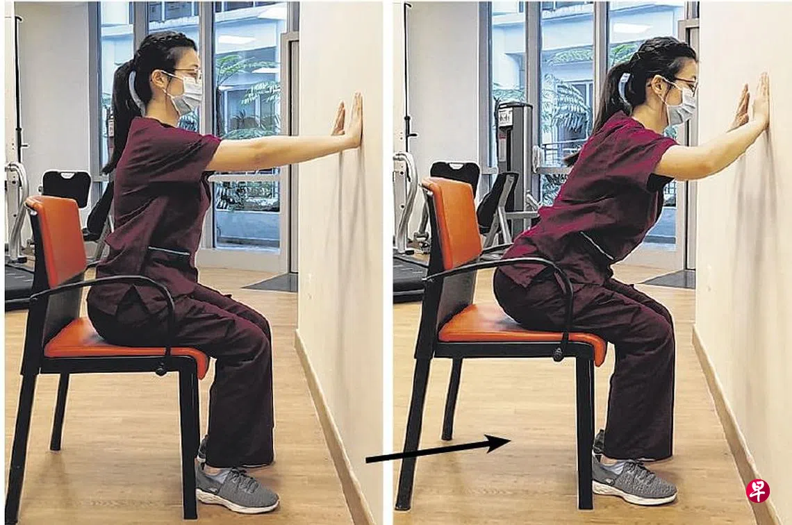 步骤:站着或坐着,与墙壁距离约10公分,两个手掌以肩宽的距离,伸直放在墙壁上,慢慢地弯曲手臂,把胸膛靠向墙壁。碰到墙壁前,慢慢地回到原本的姿势。