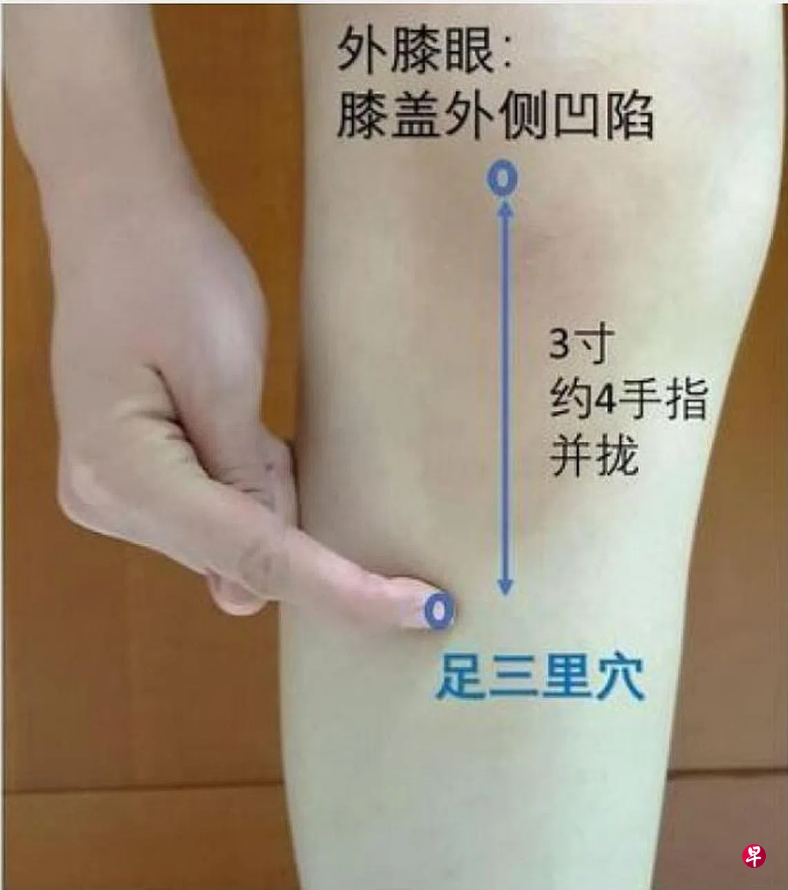 位置:膝盖外侧凹陷(外膝眼)下3寸(孩童的食指、中指、无名指和小指并拢,4手指的宽度为3寸),胫骨外侧约1横指处。