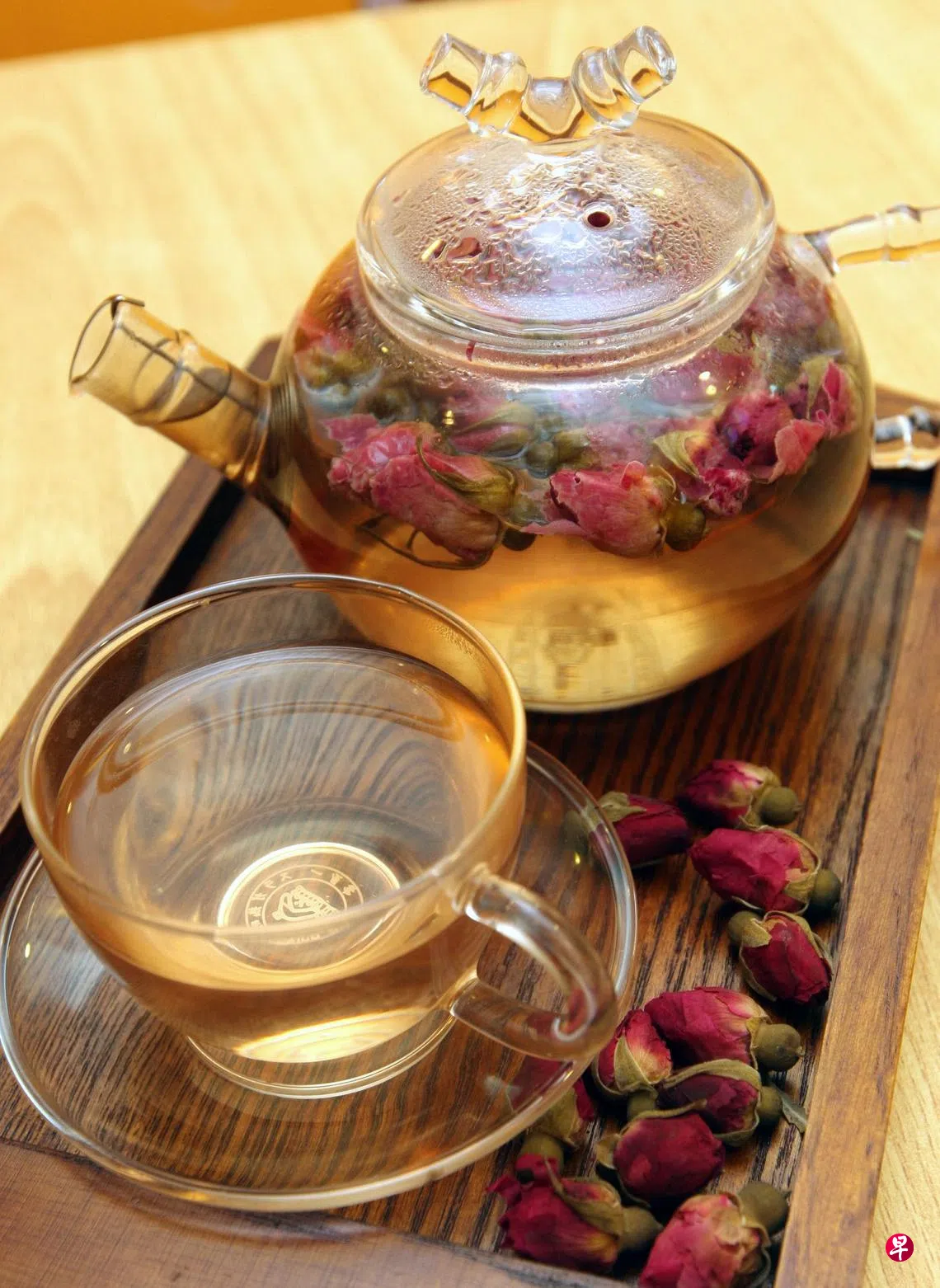 制法:将干玫瑰花、干茉莉花各5克,绿茶3克,洗净放入空茶袋,以沸水浸泡饮用。