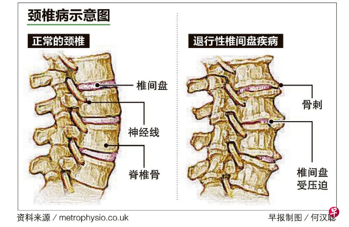 黄廷方综合医院骨外科副顾问医生刘志俊说:“人们要注意不正常的颈椎磨损与早于预期的颈椎退化症状。这可能是因为不良的姿势习惯所引起。就好比安装轮胎时,因为不对齐的情况导致轮胎容易出现不均匀的磨损。”