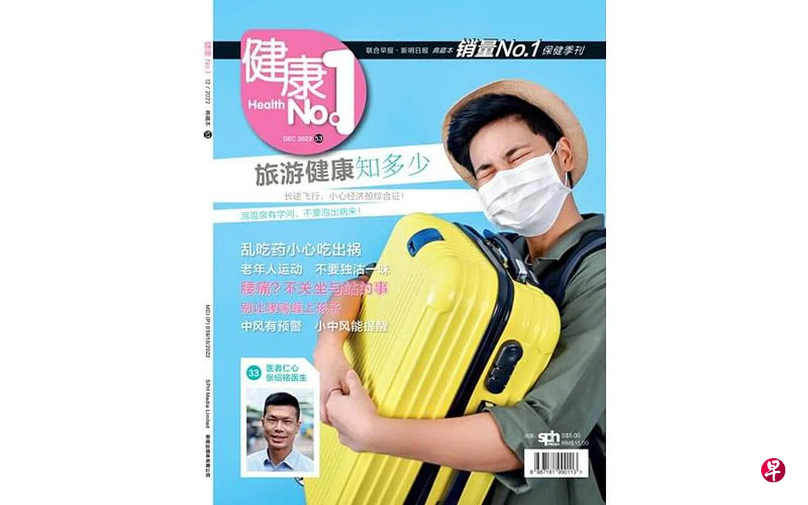 本地最畅销的中文保健季刊《健康No.1》第53期已出版。这期杂志的焦点是“旅游健康知多少”。在大家都计划年底出国旅游,在疫情反复的非常时期,出发前除了接种最新的冠病疫苗,还要注意些什么?季刊收录的课题包括:出游别忘照顾皮肤;动一动防经济舱综合征;7招跟动晕症说再见;温泉养生学问大等。