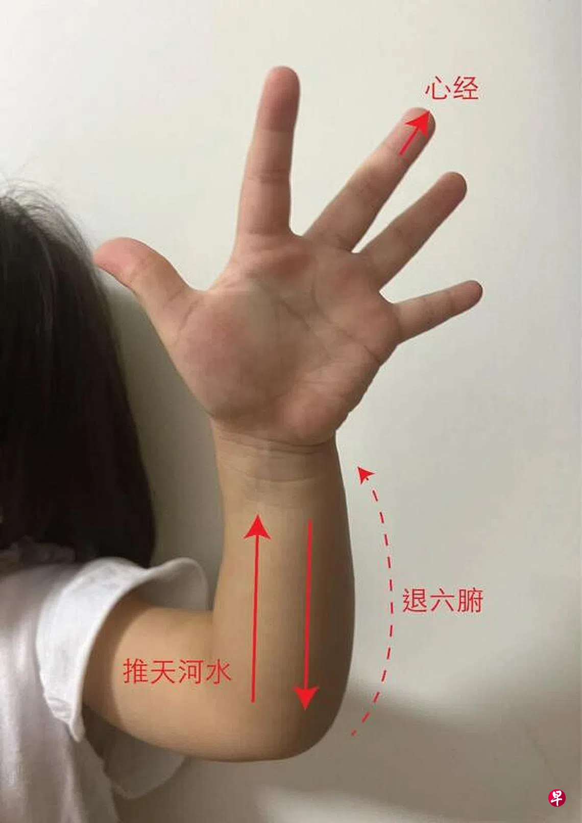小孩如果心火比较旺,也会影响睡眠。这类小朋友往往较活跃、容易兴奋、好动或爱喊叫,舌红、大便干。庆德堂的黄莹医师接受《活得好》采访时,建议可用的小儿推拿手法:清心经、推天河水、退六腑。