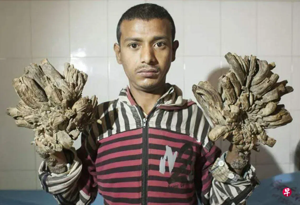 “树人症”是疣状表皮发育不良症(Epidermodysplasia verruciformis),是一种极罕见的遗传病,患者四肢会长出像树枝或树根的疣状增生,俗称树人症。“树人症”让医界不知所措,尚未找到一种完全治愈的方法,手术可以暂时去除多余的肉瘤,但又会长回来。