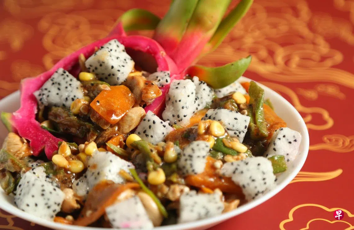 年菜未必要大鱼大肉,日常饮食中常见到的鸡肉,搭配应节的龙珠果(也称火龙果),便能飞上枝头变“凤凰”。鸡肉有丰富蛋白质,与富含膳食纤维、维生素的龙珠果、羊角豆、胡萝卜玉米粒结合,为这道菜的营养价值加分。