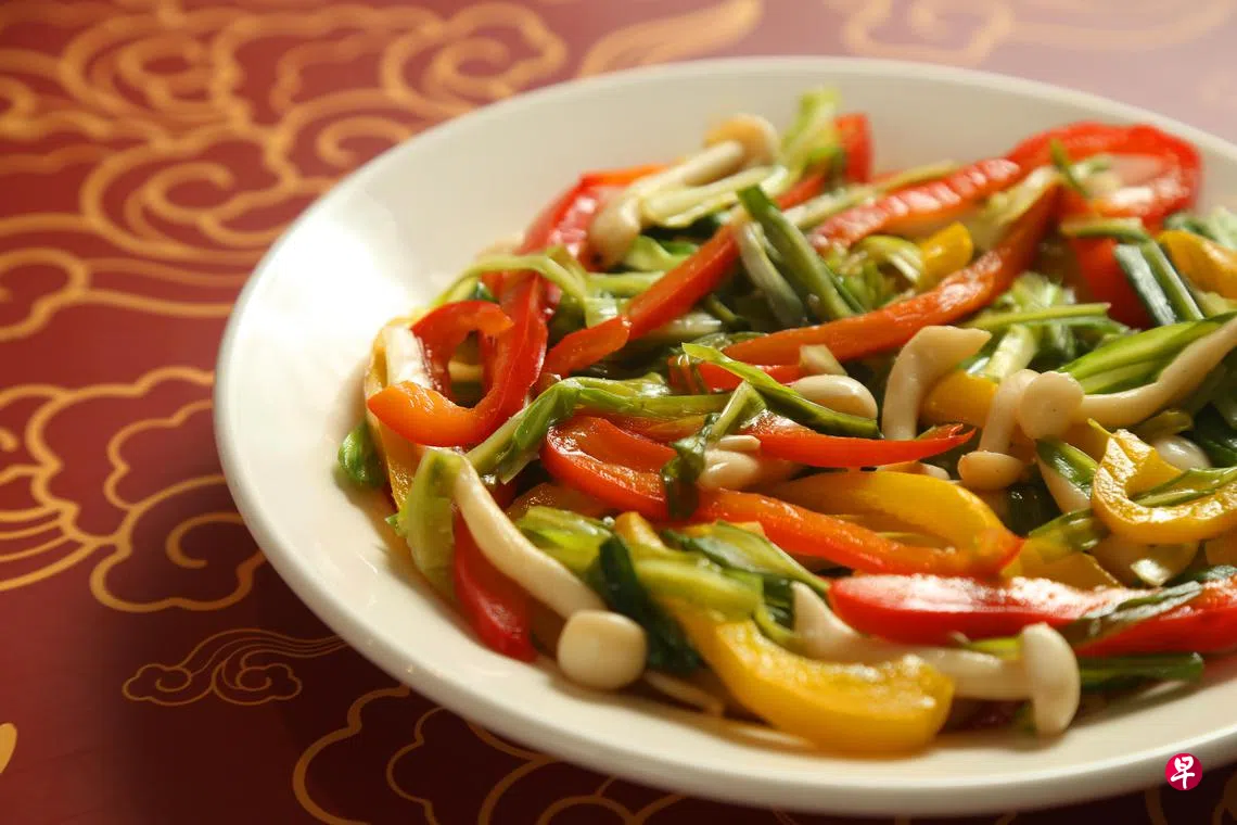 当黄、红色灯笼椒与绿色青龙菜炒在一起,三“龙”迎新岁,好运自然来。黄、红、绿色加上白色的姬松茸 (shimeji mushroom ),色彩缤纷。带点弧形的灯笼椒有律动感,这盘菜看起来“龙飞凤舞”。