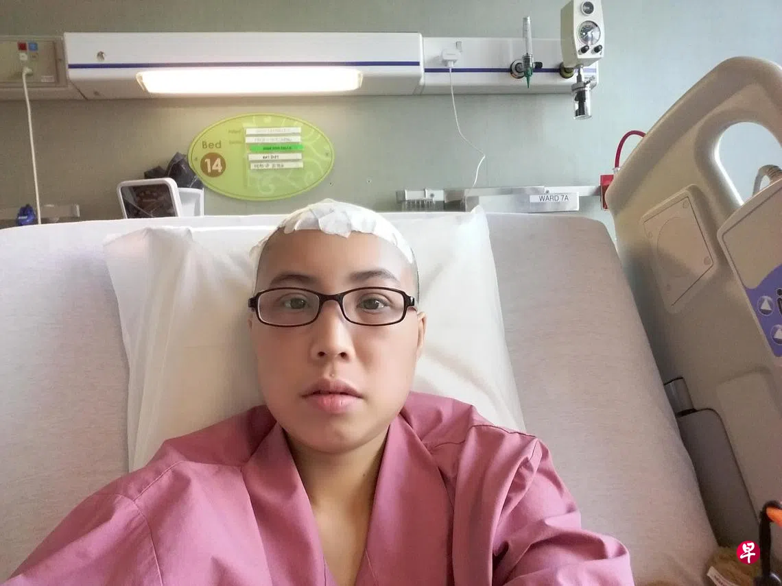 梁佩莹原本在修读人工智能(AI)研究生文凭课程,现因治疗而暂停。她说:“我一直保持健康积极的生活,注意饮食,睡眠充足。我经常游泳和跑步,也喜欢潜水和旅行。20多岁被诊断脑癌,确实让人吃惊。”当时,她一直有严重的持续性头痛,以为是刚从银行业转行到医疗保健行业的压力所致。她在樟宜综合医院接受磁共振成像检查、断层扫描和腰椎穿刺等检查。医生证实她患有脑瘤,并转介到陈笃生医院的国立脑神经医学院(NNI)接受治疗。之后,雇主推介她到新加坡国立大学医院的神经外科医生,再次做磁共振成像检查,结果证实患上胶质瘤(glioma),一种脑肿瘤。医生认为,切除肿瘤手术是最佳治疗方法。