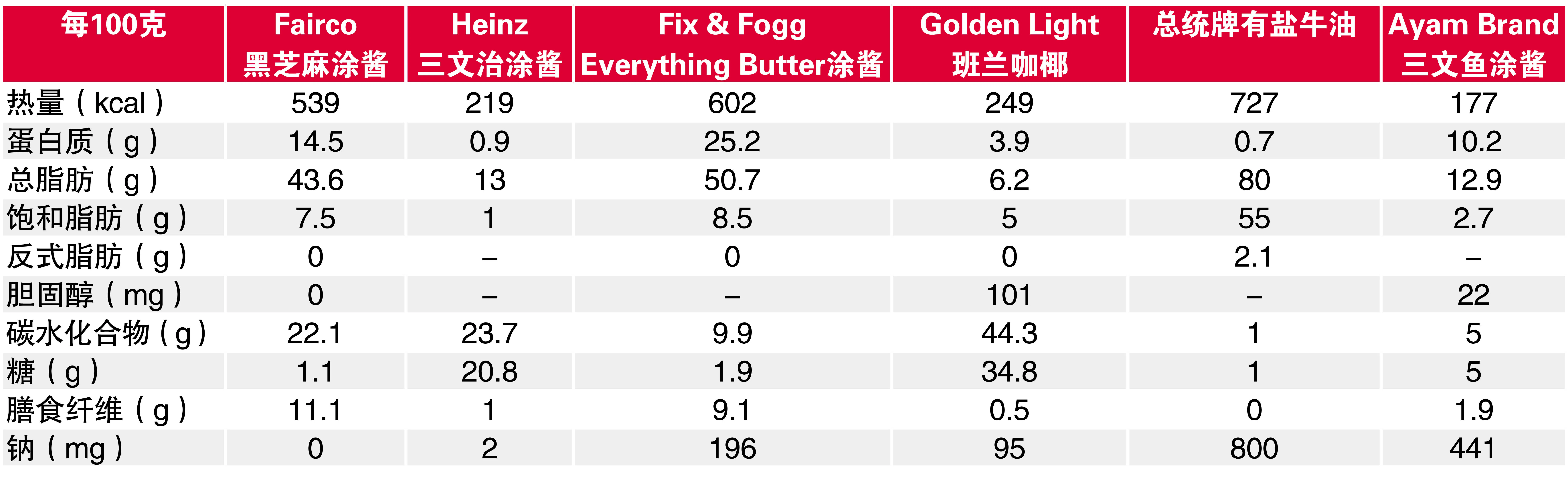黑芝麻和三文鱼涂酱的蛋白质含量较高。黑芝麻营养丰富,不过芝麻热量也不少,食用时也须节制。有花生成分的涂酱,热量也会偏高,记得别涂得太厚。